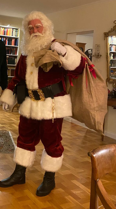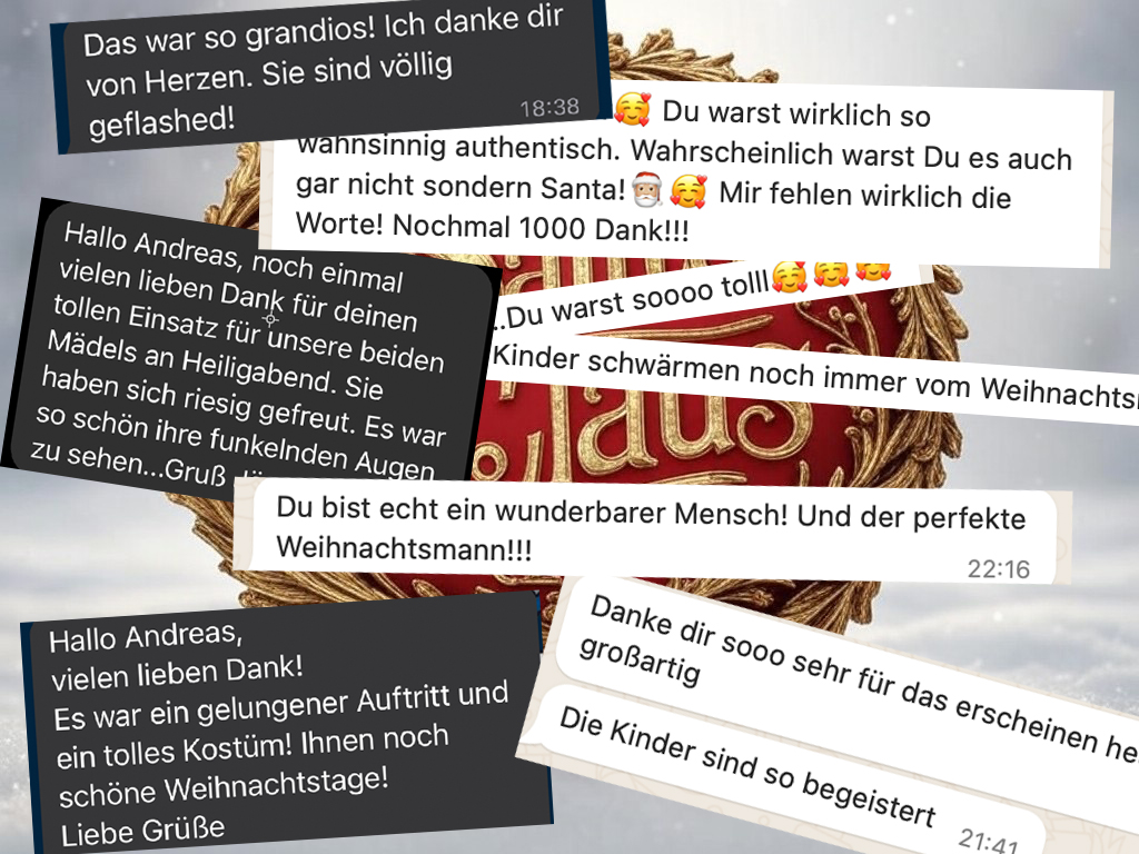 Zur ersten Planung benötigen wir deine Adresse und die Wunschzeit, zu der Santa Claus am Heiligabend kommen soll. Nach Terminbestätigung - oder falls der Termin schon vergeben ist, nach Absprache einer anderen Uhrzeit - nennst du uns weitere Wünsche, was am Heiligabend bei euch noch berücksichtigt werden soll: Z.B. - Namen und Alter des Kindes/der Kinder - Hobbys der Kinder bzw. Informationen, was das Kind/die Kinder im laufenden Jahr tolles gemacht haben - was Santa Claus sonst noch aus dem goldenen Buch vorlesen soll - Wunschzettel der Kinder (für das goldene Buch) - Ablageort, an denen Santa Claus die Geschenke finden wird usw. Wenn alle Wünsche von uns realisierbar sind, erhaltet ihr von uns die vorläufige Bestätigung hierfür und die Rechnung, die per Überweisung binnen einer Woche fällig ist. Mit Zahlungseingang bei uns gilt der Termin als verbindlich vereinbart. Wenn nach 7 Tagen noch keine Zahlungseingang bei uns zu verzeichnen ist, gilt der Termin automatisch als storniert und ist für andere Interessenten verfügbar. Eine Stornogebühr fällt hierbei nicht an. Allerdings ist eine erneute Buchung unseres Weihnachtsmannes dann nicht mehr möglich. Unser Santa Claus wird pünktlich (+/- 15 Minuten) bei euch sein und für ein besonderes Fest sorgen. Fotoaufnahmen während Santa Claus bei euch ist, sind natürlich erlaubt und ausdrücklich gewünscht. ![]() Ein Blick in Santas Kleider- und Equipmentschrank Unser Weihnachtsmann-Kostüm Besonders bei Kindern, die altersbedingt langsam an der Existenz des Weihnachtsmanns zweifeln, ist ein "echtes" Weihnachtsmann-Kostüm sehr wichtig, um den Weihnachtszauber weiter aufrecht zu halten.Unser Santa trägt natürlich keine Kunststoff-Gamaschen, sondern schwere Lederstiefel. Die Knöpfe sind 24-Karat-vergoldet und tragen jeweils zwei Namen der Rentiere des Weihnachtsmann: Dasher und Dancer, Prancer und Vixen, Comet und Cupid, Donder und Blitzen und natürlich Rudolph und Santa. Der breite und dicke Gürtel ist aus echtem Leder mit einer 24-Karat-vergoldeten Schnalle mit Weihnachtsmotiven. Die Gürtelschnalle ist selbstverständlich aus Metall und nicht aus Kunststoff. Knöpfe und Schnalle sind in Anlehnung an den wunderschönen Weihnachtsfilm "Das Wunder von Manhattan (1994)" designt. Weiße Lederhandschuhe, die Weihnachtsklingel aus Messing und der verzierte Geschenkesack aus Jute runden das Erscheinungsbild unseres Weihnachtsmannes ab. Natürlich trägt Santa keinen fizzeligen, eingefärbten Hipster-Bart, sondern einen mächtigen Rauschebart. Bis 2023 trug unser Santa Claus einen langen Kunststoffbart bzw. auf Wunsch einen Echthaarbart wie Santa in dem Weihnachtsfilm von 1994 "Das Wunder von Manhattan". Seit 2024 trägt er standardmäßig einen extra für uns gefertigten weißen Rauschebart aus aus Echthaar, nachempfunden dem von Tim Allen im Weihnachtsfilm "The Santa Clause". Natürlich besitzt Santa auch die im Film gezeigte Visitenkarte mit dem Weihnachtsmann-Vertrag.Der Echthaarbart und die ebenfalls aus Echthaar bestehende Perücke und Augenbrauen werden vor jedem Auftritt professionell geklebt. Das bedeutet, dass die jeweiligen Übergänge durch auf die Haut geklebte Einzelhaare verdeckt sind. Somit sieht Santa auch in direkter Nähe absolut echt und authentisch aus. Am Gürtel befindet sich auf der rechten Seite eine große Ledertasche, in der Santa das goldene Buch bei sich führt, in dem die guten Taten der Kinder notiert und teilweise die Wunschzettel der Kinder abgelegt sind. Auf der anderen Seite baumelt der magische Schlüssel, mit dem Santa alle Türen öffnen kann, vom Gürtel. Gemäß des amerikanischen Vorbilds trägt Santa Claus niemals eine Rute und droht auch keinen Kindern.